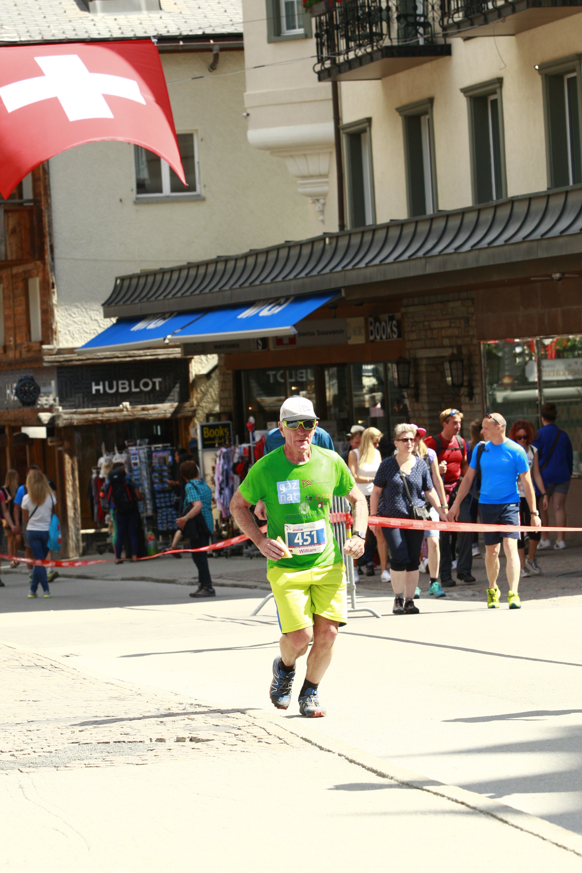 Jusqu’au 35ème kilomètre, je rejette tout le liquide que j’avais bu lors de la première partie de la course y compris une partie de mon petit déjeuner ! Je suis contraint de ralentir l’allure et même m’arrêter à plusieurs reprises. Je dois en fait laisser mon corps récupérer mais cela prend toujours 1 à 2 heures avant d’avoir à nouveau assez de force pour reprendre son allure de base. J’ai perdu beaucoup de temps mais dès le 39ème kilomètre cela va mieux. Le corps a récupéré. Le but n’est plus très loin. Cependant, il y a encore 400 m de dénivellation à franchir avant d’atteindre l’arrivée au Riffelberg sur le Gornergrat à 2585 m.