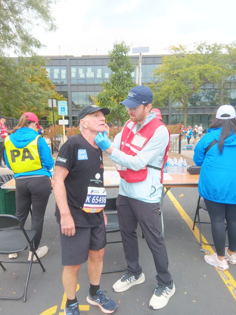 William’s goal was to finish the Chicago Marathon and join the « Abbott World Marathon Majors 6 stars club« . He succeeded, despite a scare at the 23rd kilometer: a fall behind the pacemakers could have compromised his objective. With 15 minutes’ downtime at the medical station (chin and rib injuries), he finally finished 71st out of 153 finishers in his category (H70-74).